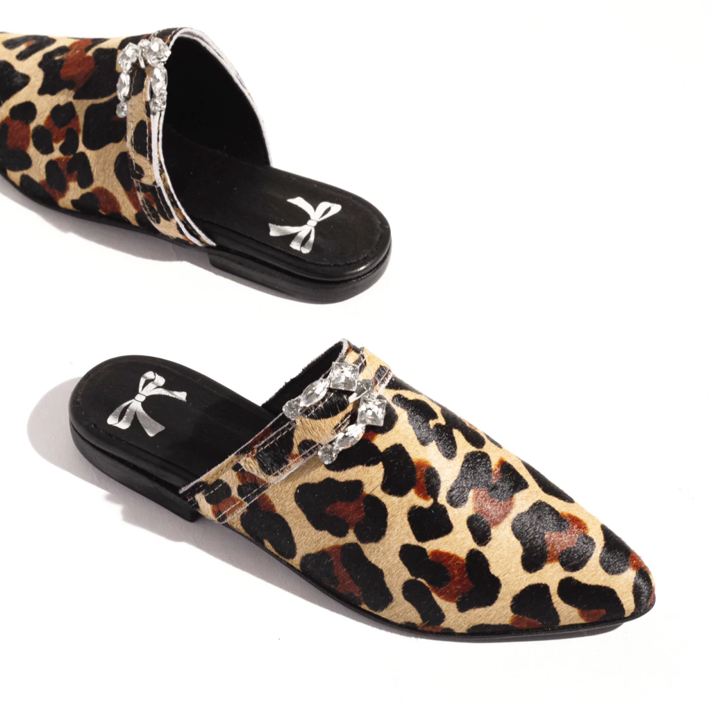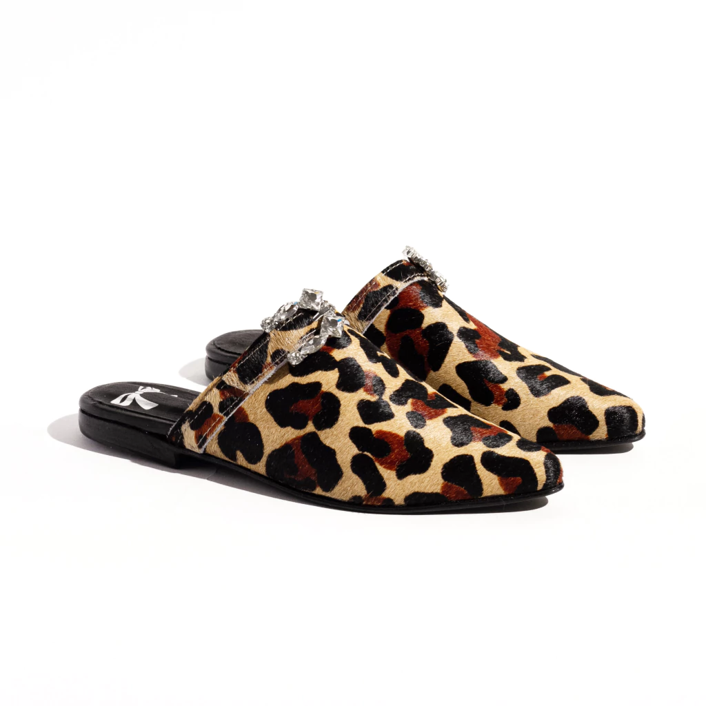 Zueco cuero vacuno pelo de leopardo con hebilla de strass importado. Suela artesanal, pintada y devirada a mano. Taco de 1 cm a tono.